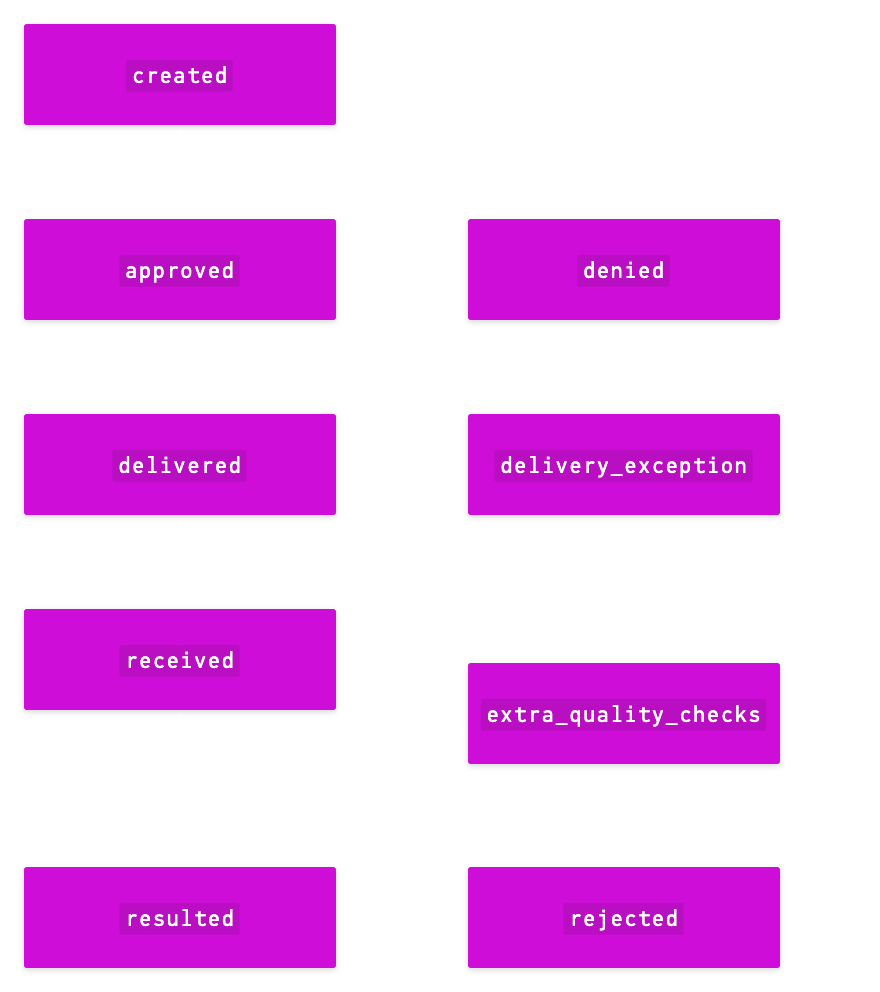 Requisitions will always possess a created event and either an approved or denied event from the time of creation. If you don't supply tracking information, then the delivered and delivery_exception statuses will be skipped.